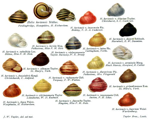 Привет, коллеги! В средине 50-х годов прошлого столетия группа малакологов (Cain, Sheppard, Lamotte и др.) предложили новое направление, находящиеся на стыке малакологии и учения о микроэволюции - т.наз. "сравнительную полиморфологию" (comparative polymoprhology). Они использовали два широкораспространенных в Западной и Северной Европе вида наземных моллюска рода Cepaea - C.nemoralis и C.hortensis. Улитки эти действительно уникальные. Они характеризуются наличием большого числа цветовых форм - как по окраске самой раковины, так и по наличию/отсутствию/слиянию отдельных пигментных лент на раковине. Вся вторая половина прошлого столетия прошла под флагом исследования данных видов (в Европе). И в его конце ряд ученых организовали т.наз. MegaLab. (Кто желает - может найти описание этой структуры в Интернете.) Это - международная организация, целью которой является координацию и интеграция всех исследований по видам рода Cepaea - C.nemoralis и C.hortensis. К сожалению, на территории бывшего СССР данные виды практически не встречаются. Но зато есть еще один вид этого рода - Cepaea vindobonensis (Венская улитка). Этот вид не столь полиморфный, как его родственники (сейчас, говоря о цветовых вариациях, говорят не "полиморфизм", а "полихроматизм"), но тем не менее также имеет две вариации по фону раковины (нормальная форма и форма pallescens), и также встречаются различные вариации по наличию/отсутствию/слиянию отдельных пигментных лент на раковине. По крайней мере для Украины, Cepaea vindobonensis - широкораспространенный вид с заметной тенденцией к антропохории. Кроме естественных или полу-естественных мест обитания населяет пригодные (лесистые или кустарниковые) биотопы в населенных пунктах (парки, живые изгороди, кладбища, пустыри и т.п.). И численность его не маленькая в местах обитания. Cepaea vindobonensis также широко встречается и в России (особенно, южной).