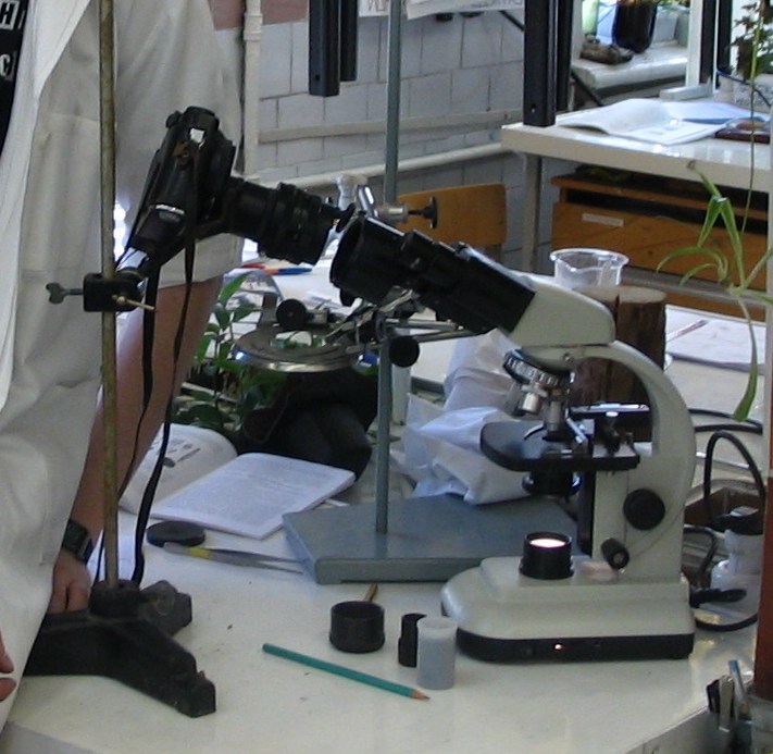 я в целом пользуюсь таким же приспособлением как и Максим, иногда правда есть возможность фотографировать при помощи камеры прилеплённой к бинокуляру Leica ZM - там специальная дырочка для камеры и картинка выводится прямо на монитор компьютера, качество фотографирования однако посредственное, ибо там всего 1 мегапиксель. а на фото моё приспособление для фотографирования которое я использовал будучи на первом курсе. Суть заключается в слудующем: у микроскопа снят окуляр, вместо него на определённом отдалении закреплена на штативе линза от фотоувеличителя, таким образом чтобы увеличиваемая картинка была по минимуму "обрезана" далее на небольшом расстоянии крепился на штативе фотоаппарат "Зенит-ЕМ" с кольцами для макросъёмки. Резкость фотоаппарата наводится на линзу, опять же чтобы по-максимуму её охватить. Таким же образом можно делать и с бинокуляром. весьма недурные снимки получаются. Надеюсь теперь на приз за оригинальность конструкции