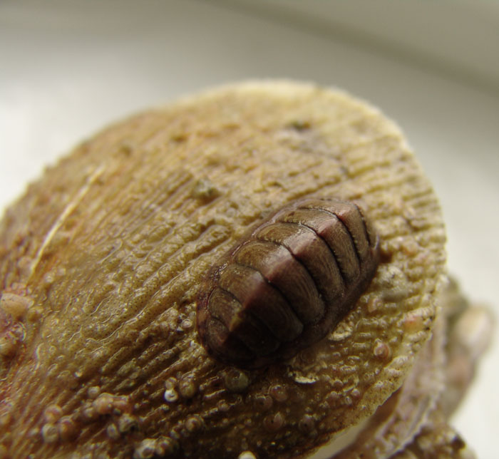 Панцырный моллюск (Polyplacophora) на раковине гребешка