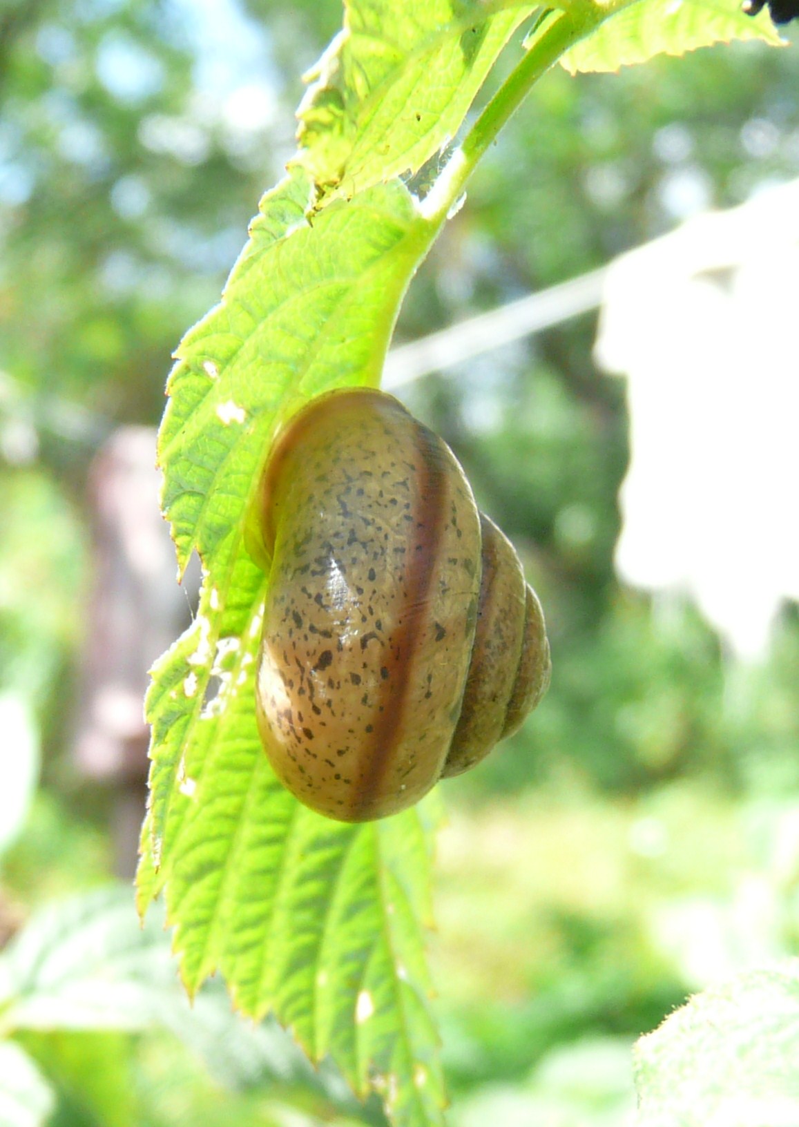 Улитка сидит под листом малины в саду около г. Тверь. Россия.