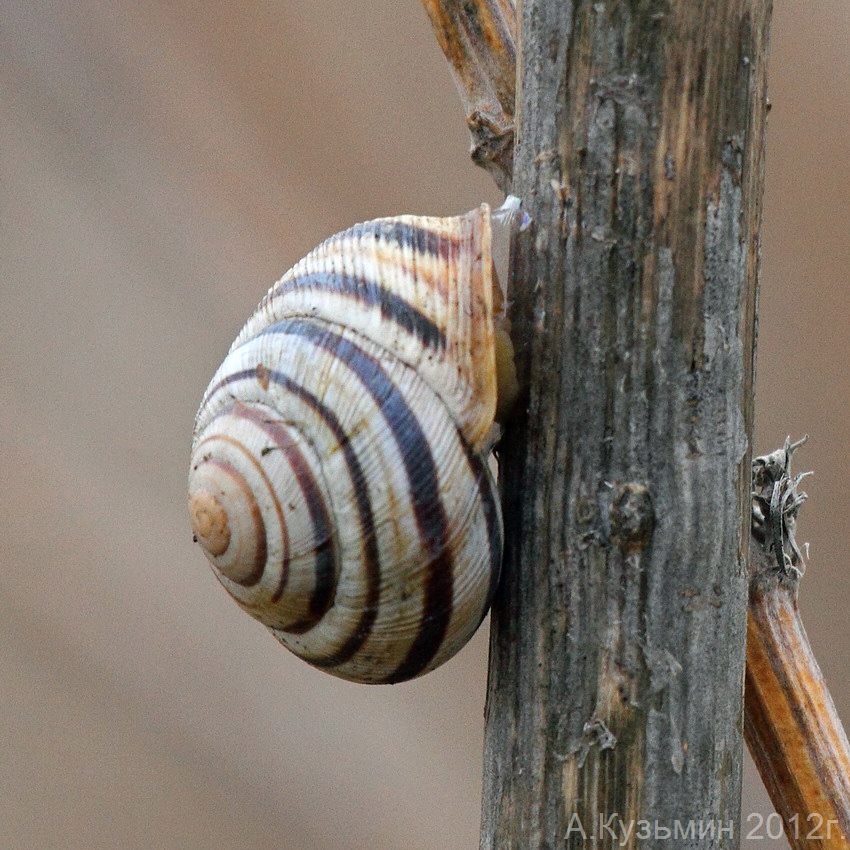 Cepaea vindobonensis на сухом прошлогоднем тростнике. 09.04.2012г. Неклиновский район Ростовской области